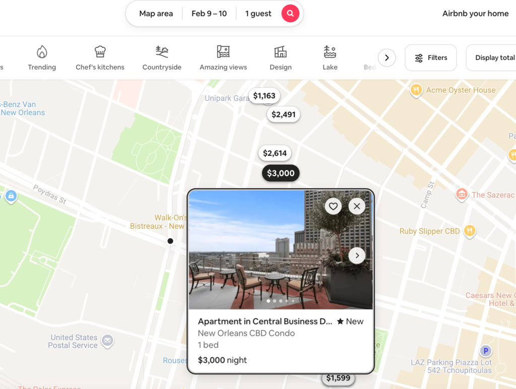 The cost of an Airbnb near Caesars Superdome tonight, 1 Guest